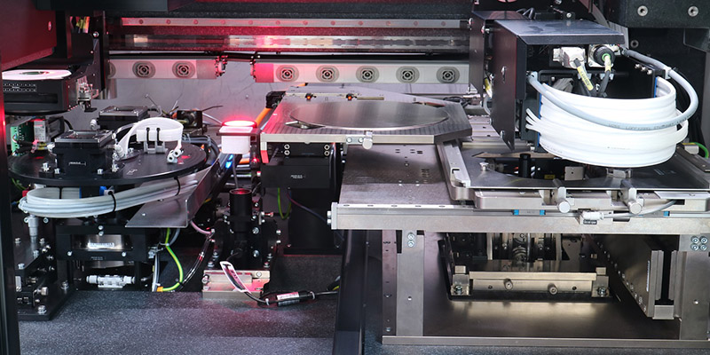 The core is the bonding table equipped with two bonding chucks. While from the chip side the machine uses ASM AMICRA dynamic alignment method to pick chips and bond with high precision to a submount, the submount side loads new submount and unloads finished CoS, in parallel it can perform stamping or preform handling.